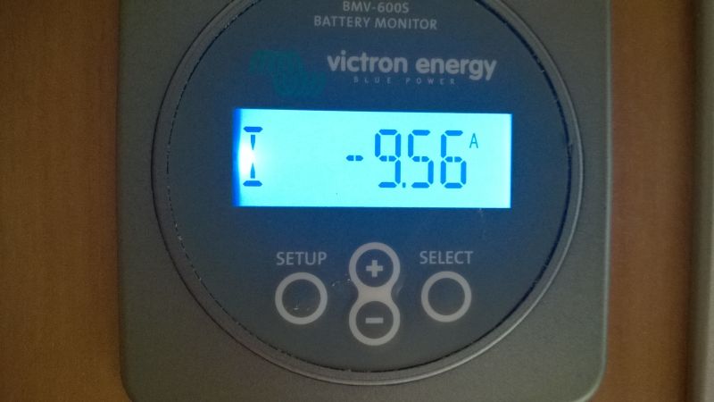 Experimental am pus frigiderul rulotei pe 12V, sa consume curent din baterie. In ecranul de mai jos se vede consumul instantaneu si este URIAS: de-asta nu-i bine sa tinem frigiderul pe 12V: