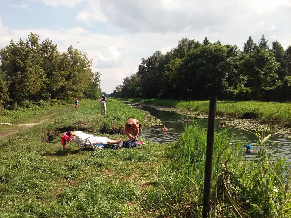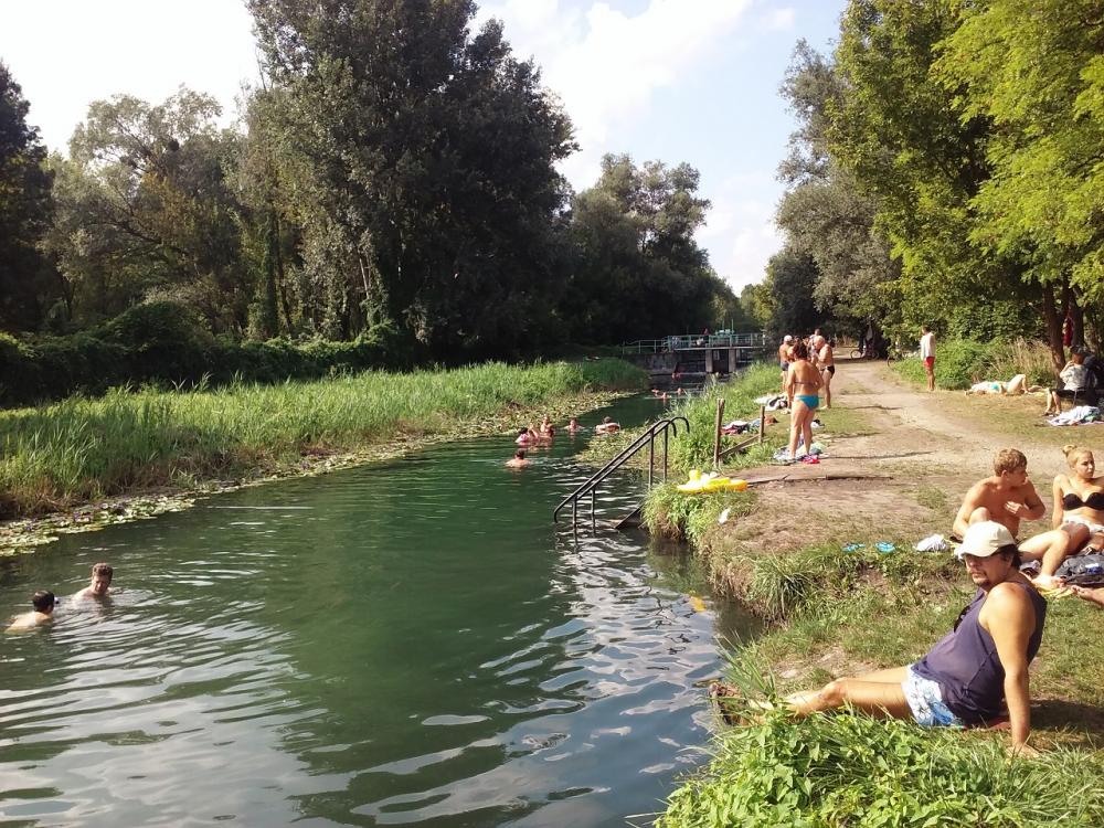 @2) la rau, care este canalul de deversare a lacului care are un izvor cu un debit ce poate inlocui apa din lac in 24 de ore si care trece prin camping unde este canalizat si plin cu nuferi spre bucuria turistilor si dupa un stavilar devine un rausor cu apa putin adanca in care se scalda o multime de oameni.