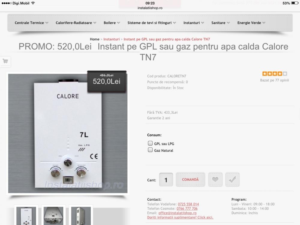 -pentru instantul de apa calda prezentat de Bogdan Ionita trebuie sa avem o presiune de cel putin 1,5 bar in reteaua de alimentare cu apa,altfel nu va functiona.Folosesc acest instant pe timp de vara la un dus in aer liber si sunt foarte multumit: apa calda non stop -imediat ce pornim dusul,siguranta(protectii in caz ca ramanem fara apa sau gaz).