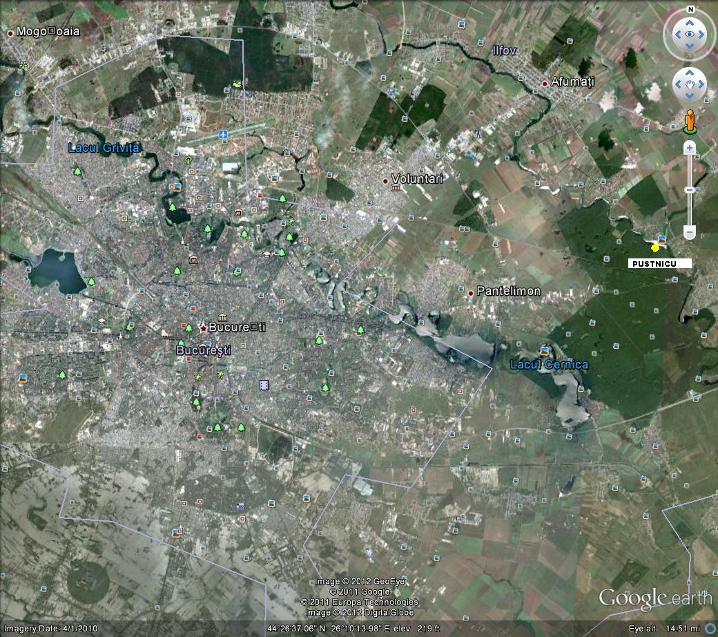 Peti, ca sa-l gasesti cu "gugli" trebuie sa tastezi "cozieni" si la sud de lacul Pasarea este Padurea Pustnicu.