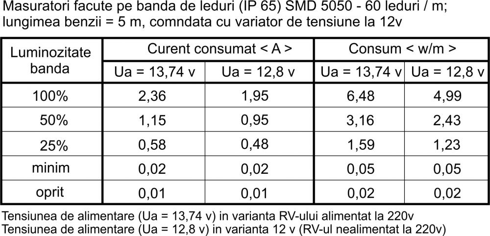 Vazand de ce este capabil variatorul si avand o banda cu un iluminat mediu (SMD 3528), am achizitionat o noua banda mai puternica (SMD 5050) si am facut cateva masuratori sa vad in ce masura scade curentul consumat in raport cu scaderea iluminarii benzii cu leduri.
