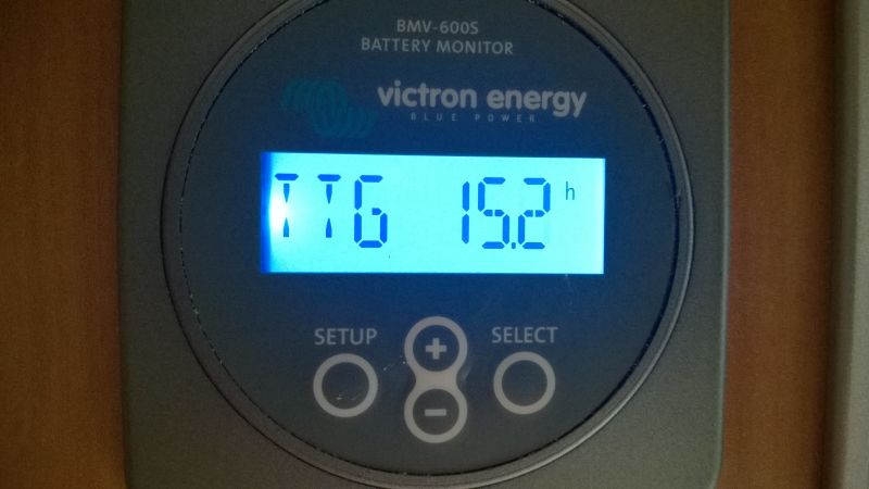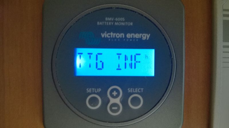 Un alt ecran foarte important este ecranul "TTG": Time To Go, cat timp mai pot continua sa consum in ritmul actual pana ajunge sa consum 50% din capacitatea bateriei. Daca eu am pus la configurare ca bateria mea este de 150Ah monitorul imi va permite sa consum circa 75Ah, dar va tine cont de formula Peukert pentru a calcula consumul real in functie de rata de descarcare a bateriei. Timpul afisat mai jos "INF" (infinit) este din cauza ca in acest moment nu am consum, din contra, bateria se incarca de la solar: